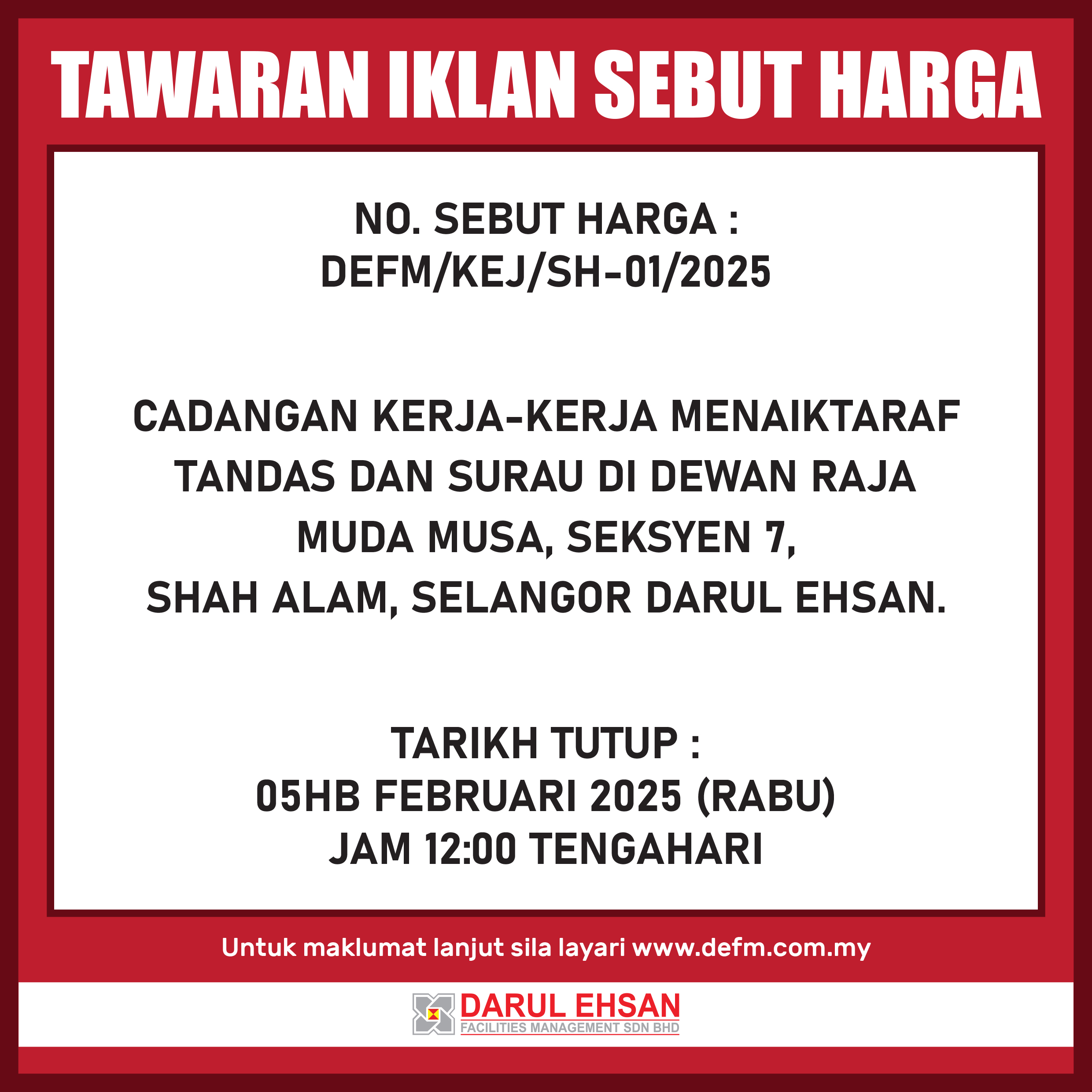 Darul Ehsan Facilities Management Sdn Bhd (DEFM) menjemput kontraktor yang berkelayakan dan berdaftar dengan DEFM untuk menyertai tawaran tender ini.